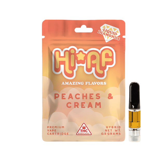 Hi*AF's Peaches & Cream frolics on your taste buds with the tart ripeness of fresh peaches luxuriously swirled with fluffy, sweet cream flavor, which is expertly blended with premium-quality liquid diamond concentrate, delivering a sun-kissed, harmonious flavor and aroma that embody the essence of fun fruitiness with every breath.
