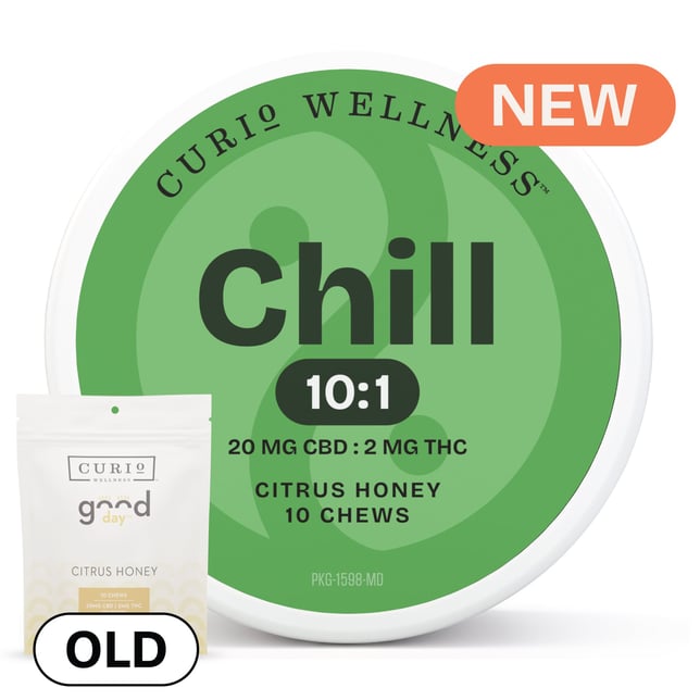 Elevate your wellness routine with Curio Wellness Chill Citrus Honey Chews. Thoughtfully crafted for balance and bliss, these flavorful chews come in two expertly formulated CBD-to-THC ratios—2:1 (20mg CBD:10mg THC) and 10:1 (20mg CBD:2mg THC)—designed to support relief from stress, pain, and anxiety. Each chew offers a soothing burst of zesty citrus paired with the comforting sweetness of golden honey, delivering a deliciously calming experience. Made without gelatin and infused with natural flavors and colors, they’re as kind to your body as they are to your taste buds. Wellness never tasted so good